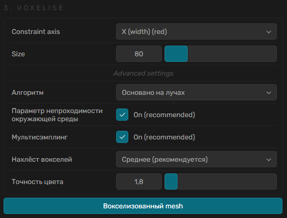 * **Далее нужно вокселизировать нашу 3D модель.** Делается это в третьем пункте Voxelise. Настройте размер в строке Size, можете воспользоваться прочими настройками или оставить как есть. Когда всё готово нажимаем "Voxelise mesh" или "Вокселизованный mesh", и наша модель превратится в вариант состоящий из кубов.