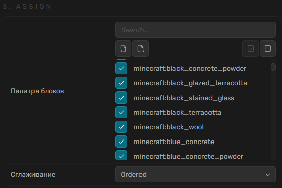 * **Последним шагом нужно настроить вид и палитру блоков.** Делается это в четвёртом пункте Assign, на сайте опечатка, он обозначен третьим. Настройте доступные блоки, можете воспользоваться прочими настройками для падающих блоков, точности цвета и гладкости. Когда всё готово нажимаем "Assign blocks" или "Назначить блоки", и нам станет доступно извлечение постройки в виде файла.