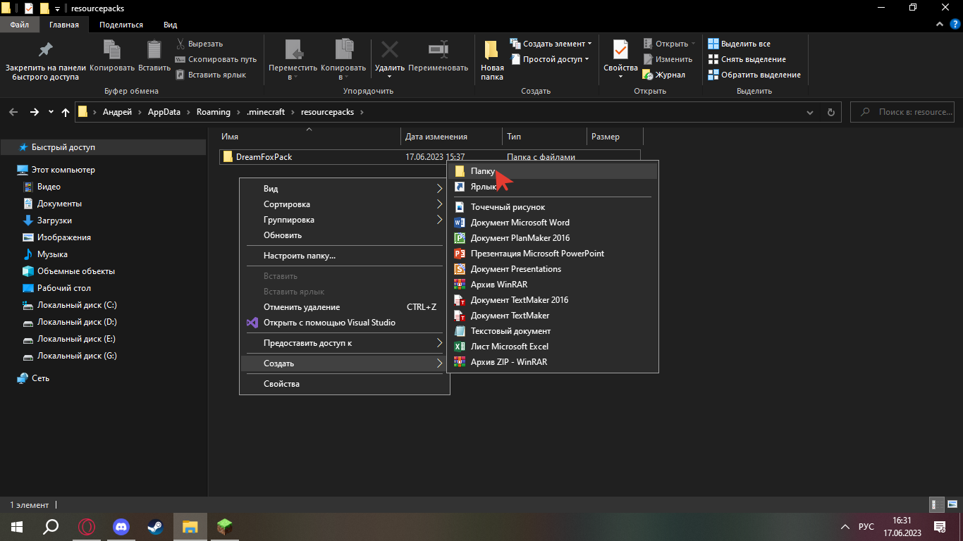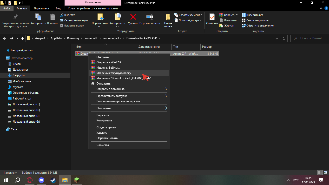 4. Теперь нужно распаковать скачанный ZIP-файл ресурс-пака в созданную папку. Для этого можно перенести ZIP-файл в папку, нажать ПКМ по ZIP, выбрать «извлечь в текущую папку».